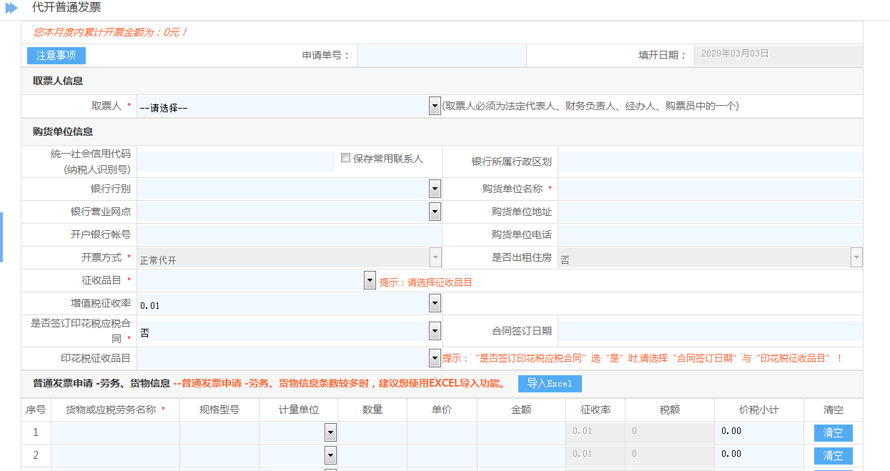 登录电子税务局,点击“我要办税”---“代开发票”---“代开发票办理”,系统默认按照1%的征收率计算税额,如下图所示: