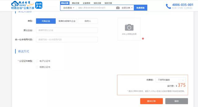 填写完成后,确认信息无误后,点击提交订单即可直接付款提交;点击保存可保存订单,在控制台-商标·知产-商标交易公证处可进入编辑页面再次修改。